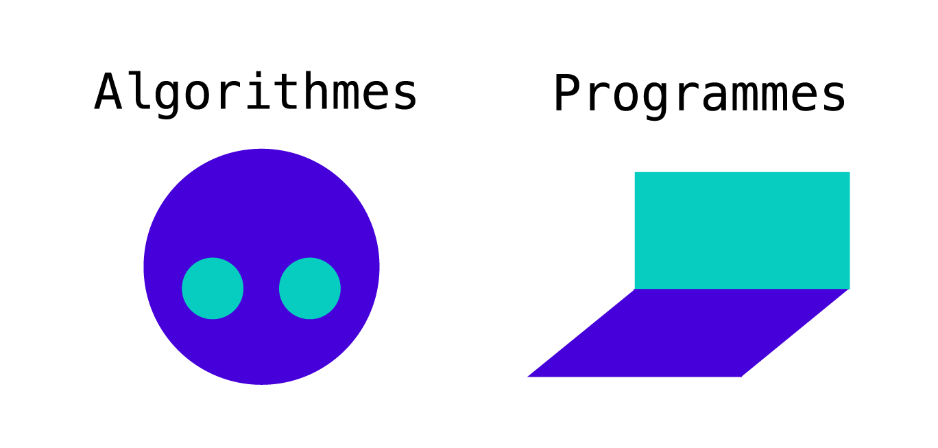 Ce n’est pas l’algorithme qui est exécuté sur une machine pour nous donner une solution concrète pour tous ces problèmes. L’algorithme n’est donc pas un programme. L’algorithme décrit plutôt un « mode d’emploi », qui permet de réfléchir à un problème de manière générale et ensuite de créer un programme. C’est le programme qui sera exécuté par un système informatique pour concrètement résoudre le problème. En d’autres mots, l’algorithme décrit l’idée humaine derrière la solution d’un problème, alors que c’est le programme qui permet à une machine de trouver une solution numérique dans des cas précis.