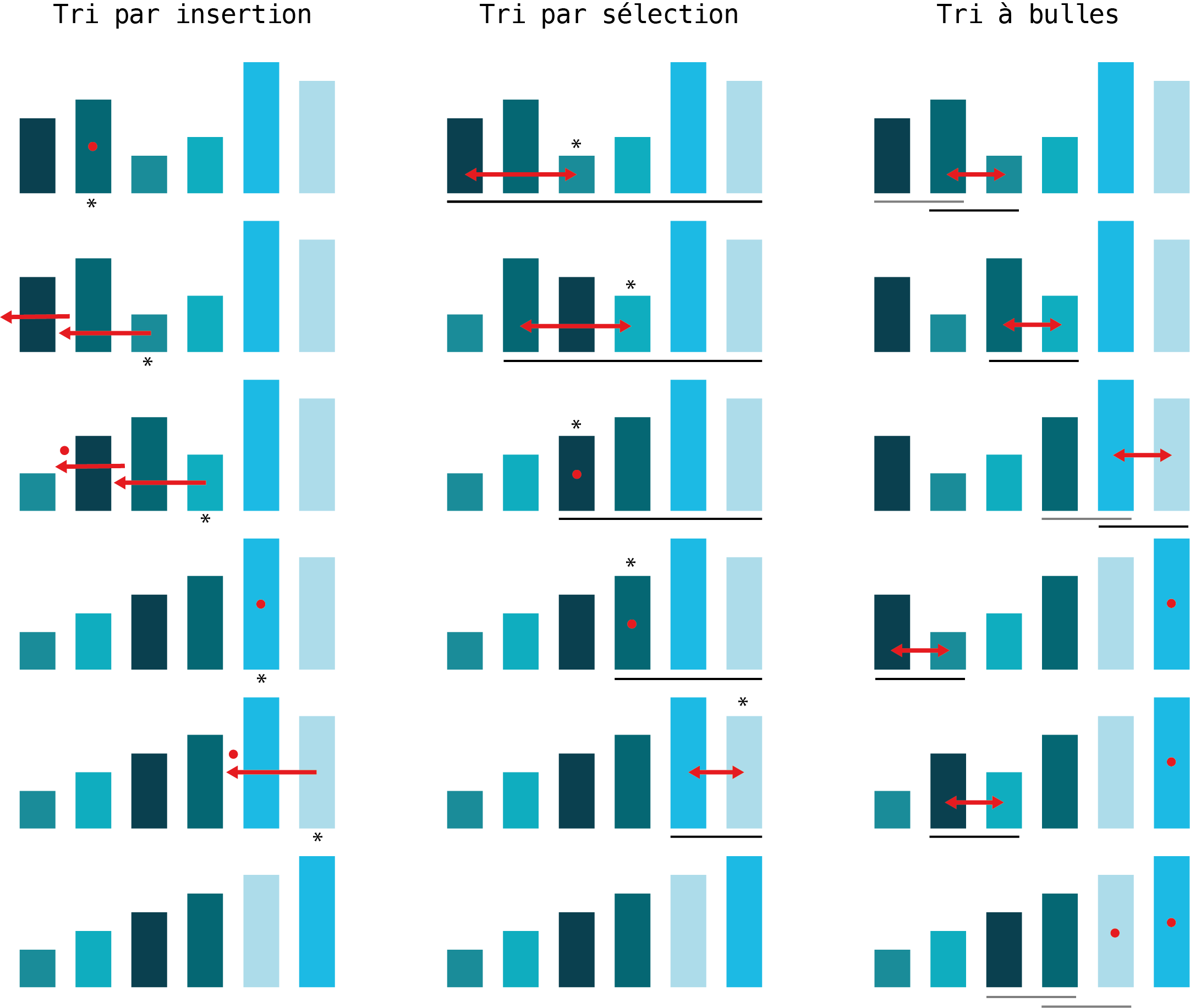 Algorithmes de tri. Etapes intermédiaires lors de l’application des différents algorithmes de tri. La flèche rouge montre les mouvements des éléments suite à une opération. Si l’élément ne bouge pas, la flèche rouge est remplacée par un point rouge. A gauche, le tri par insertion. L’étoile dénote l’élément considéré à un moment donné. Au milieu, le tri par sélection. L’étoile désigne le plus petit élément de la liste non triée. A droite, le tri à bulles. Ici le point rouge signale les éléments triés.¶