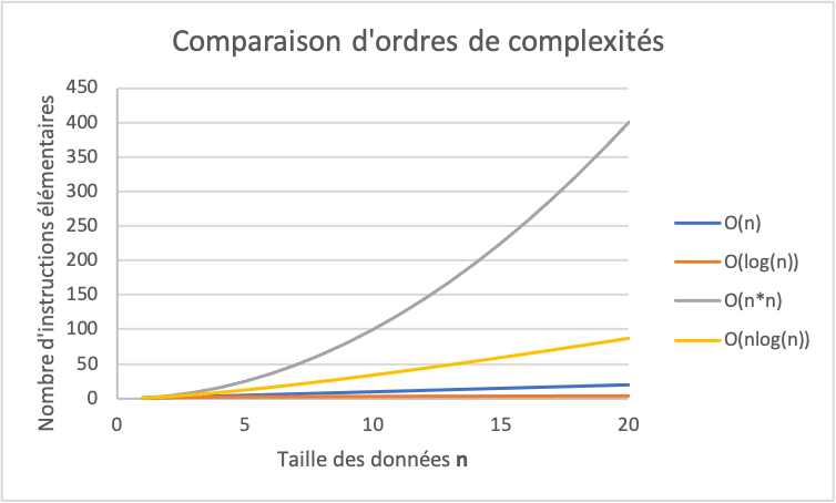 Comparaison des ordres de complexité vus jusqu’ici. Plus le nombre d’instructions élémentaires grandit avec la taille des données, plus l’algorithme est lent