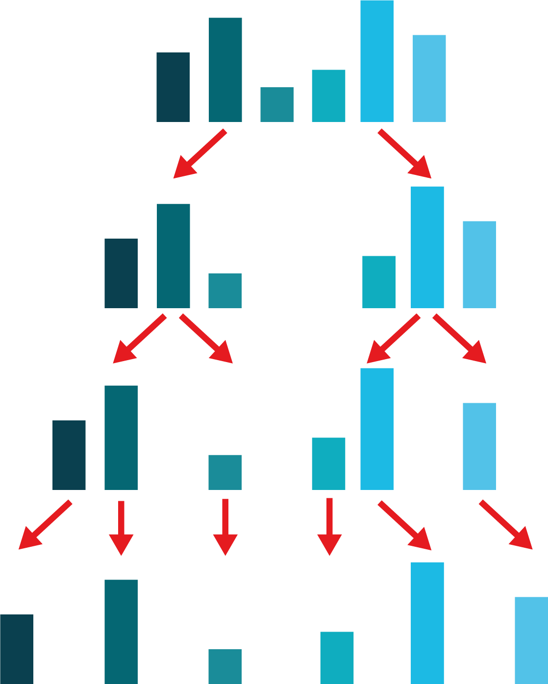 Diviser. Illustration de la première phase du tri fusion. A chaque étape le tableau est découpé en deux jusqu’à ce qu’il ne reste que des tableaux à 1 élément