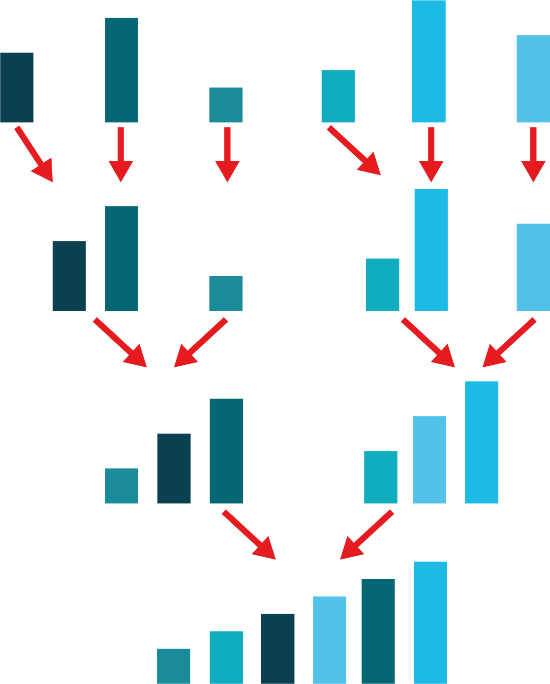 Fusionner. Illustration de la deuxième phase du tri fusion. A chaque étape les tableaux sont fusionnés par paires de deux, en faisant attention à respecter l’ordre de tri. On continue ainsi jusqu’à ce qu’il ne reste qu’un tableau unique
