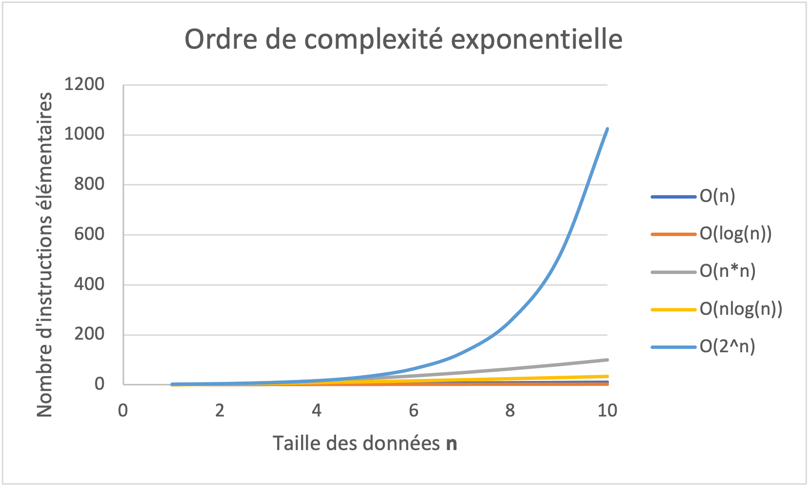 Comparaison de l’ordre de complexité exponentielle avec les ordres de complexité vus jusqu’ici. Dans un ordre de complexité exponentielle, le nombre d’instructions élémentaires grandit très rapidement avec la taille des données, et l’algorithme est de plus en plus lent.¶