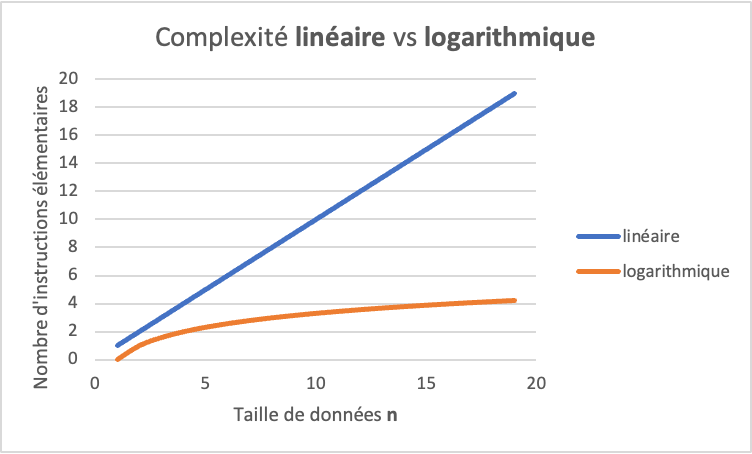 Comparaison de complexités logarithmique et linéaire. Un algorithme de complexité logarithmique est plus rapide qu’un algorithme de complexité linéaire.¶