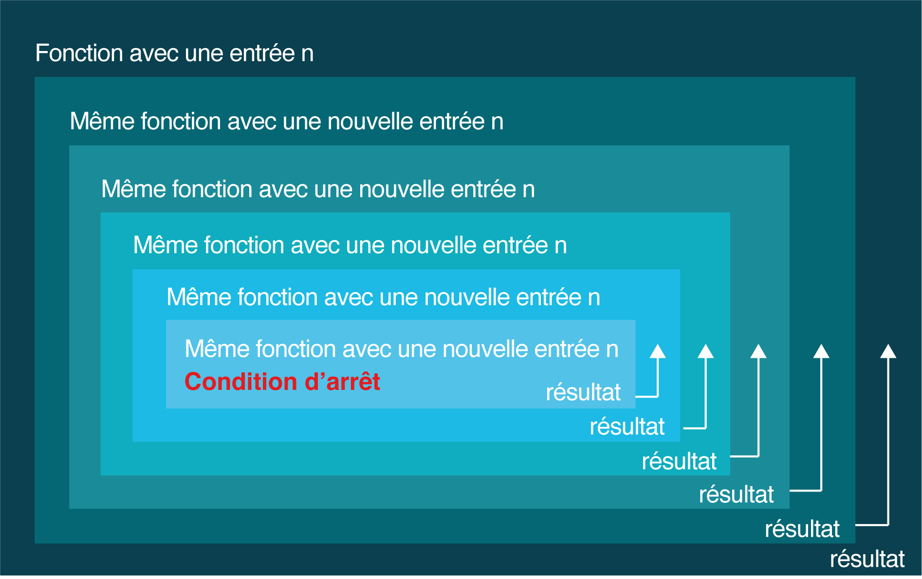 Schéma d’une fonction récursive. La fonction s’appele elle-même. toujours avec un autre paramètre en entrée, jusqu’à ce que la condition d’arrêt soit remplie. A ce moment-là, un résultat est calculé et retourné à la fonction du dessus (celle qui à appelé la fonction). Ainsi tous les résultats sont retournés au fur et à mesure et permettent de calculer la fonction souhaitée.¶