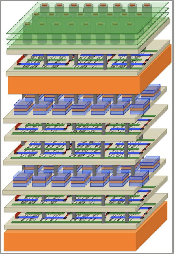Nouvelle conception d’architecture hybride de type «gratte-ciel» : elle est basée sur des matériaux plus avancés que le silicium ; les unités de mémoire et les transistors à base de nanotubes de carbone sont empilés successivement