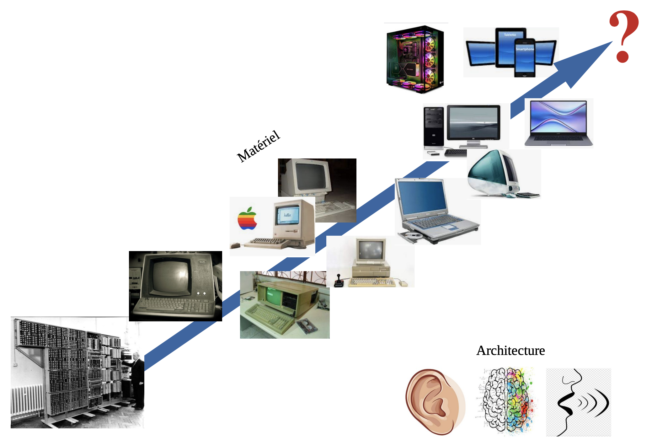 On en revient donc, finalement, au problème de la perception : ce que perçoit le plus grand nombre, c’est l’aspect composants, le matériel, le «hardware»… qui effectivement a profondément évolué depuis plus de 70 ans : de la carte perforée aux disques SSD en passant par la disquette, des tubes à vides aux microprocesseurs en passant par les transistors, des grosses unités de bureau des années 80 aux smartphones d’aujourd’hui, des écrans monochromes de 9 pouces des premiers Macintosh aux écrans couleurs 24 pouces full HD Wled d’aujourd’hui. Ce que perçoit le plus grand nombre, c’est également le bouleversement rapide et important amené par l’ordinateur, dans la vie sociale, et le travail ; encore un élément qui éloigne l’utilisateur lambda d’une visibilité claire de l’aspect assez immuable de l’ordinateur d’un point de vue conceptuel.