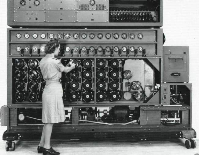 ENIAC, Université de Pennsylvanie : opérationnel à la fin de 1945, dévoilé au public en février 1946. Il pèse 30 tonnes et occupe une surface de 167 \(m^2\). Sa fonction est principalement de calculer des tables de tirs. Ces dernières étaient calculées par des femmes engagées par l’armée, et ce sont également ces six femmes appelées “The Computers” qui seront les premières programmeuses de cette machine4. L’ENIAC est le premier calculateur entièrement programmable.