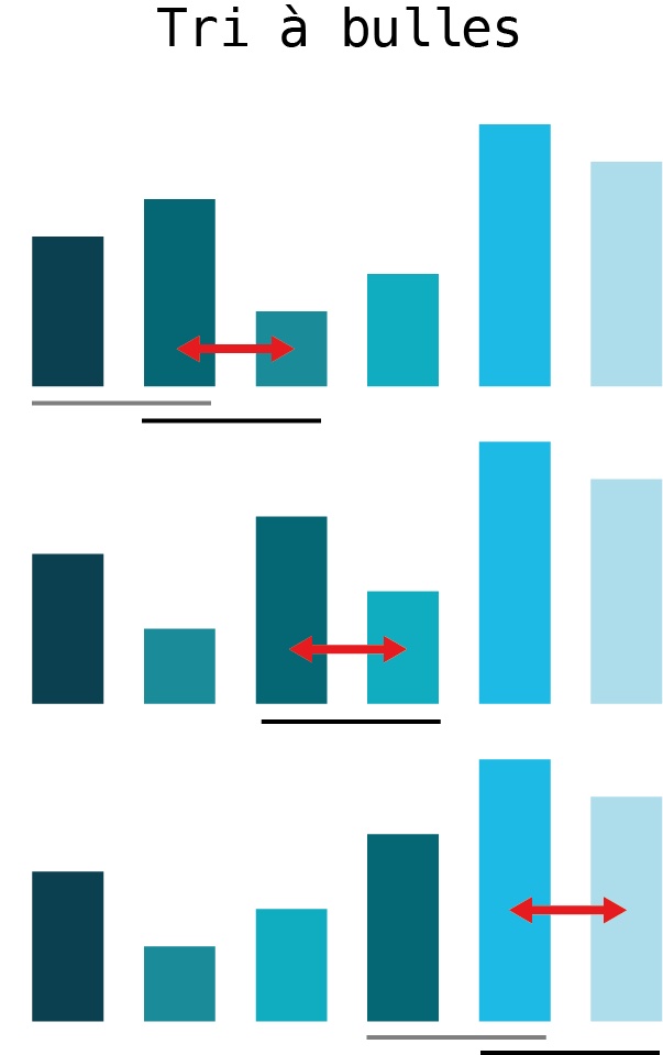 L’algorithme du tri à bulles compare les éléments voisins, deux par deux, et les met dans le bon ordre. Le mot ‘bulles’ fait référence aux bulles dans une boisson qui montent à la surface.