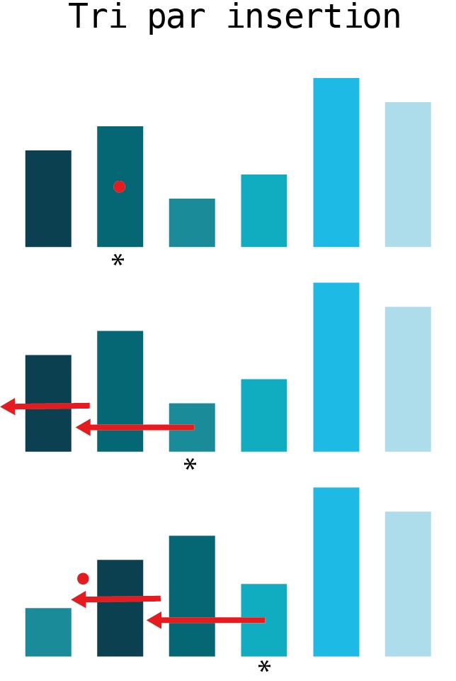 L’algorithme du tri par insertion parcourt la liste d’éléments à trier du deuxième au dernier élément. Pour chaque nouvel élément considéré, il l’insère à l’emplacement correct dans la liste déjà parcourue.