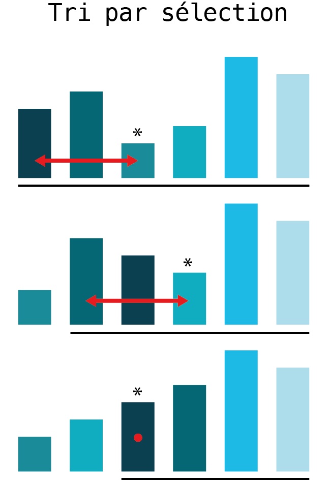 L’algorithme du tri par sélection commence par rechercher le plus petit élément de la liste et l’échange avec le premier élément de la liste.