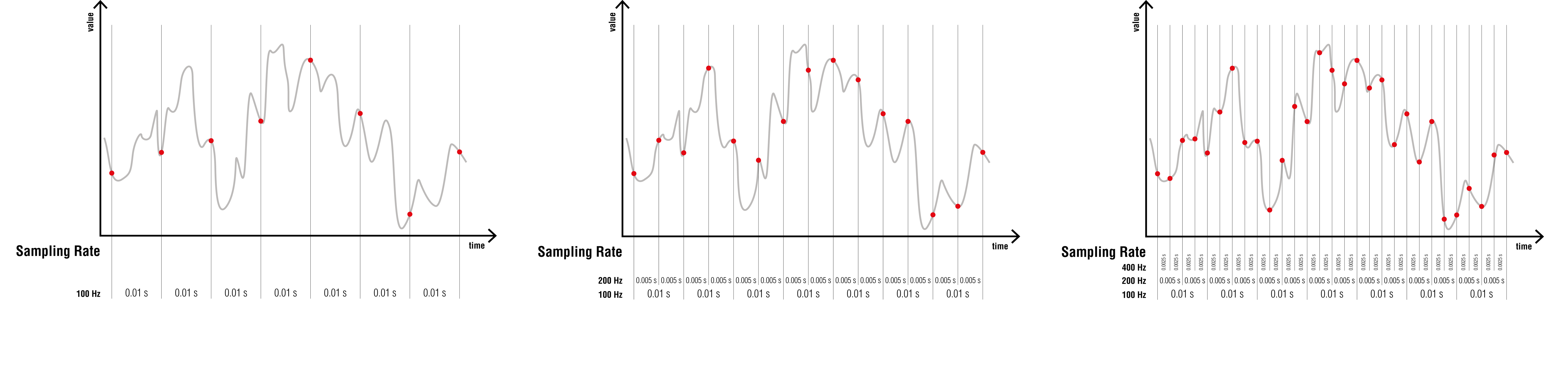 L’intervalle temporel entre deux mesures est appelé la période d’échantillonnage. La fréquence d’échantillonnage (sampling rate) est le nombre de mesures prises par seconde, exprimée en Hz.