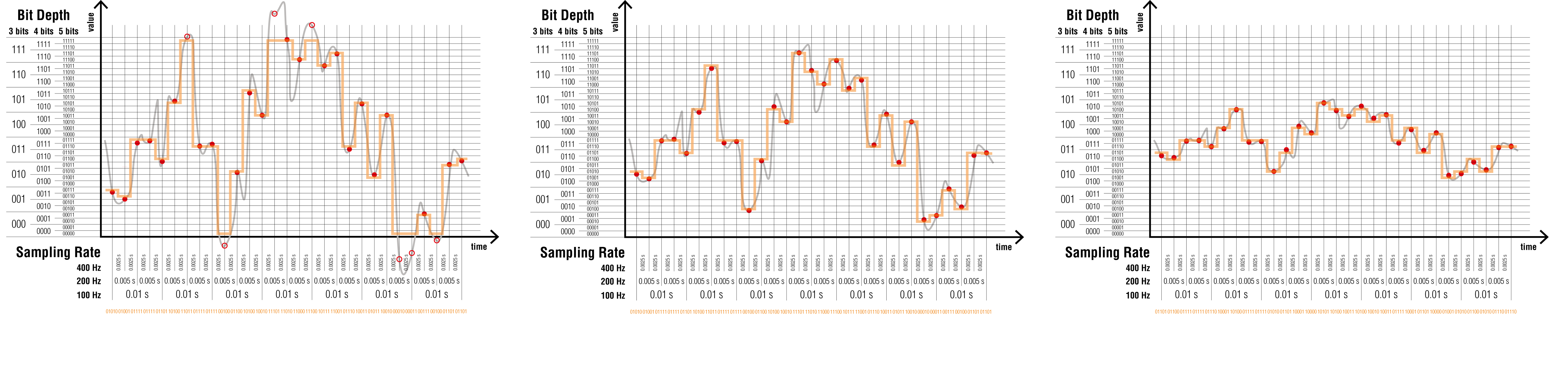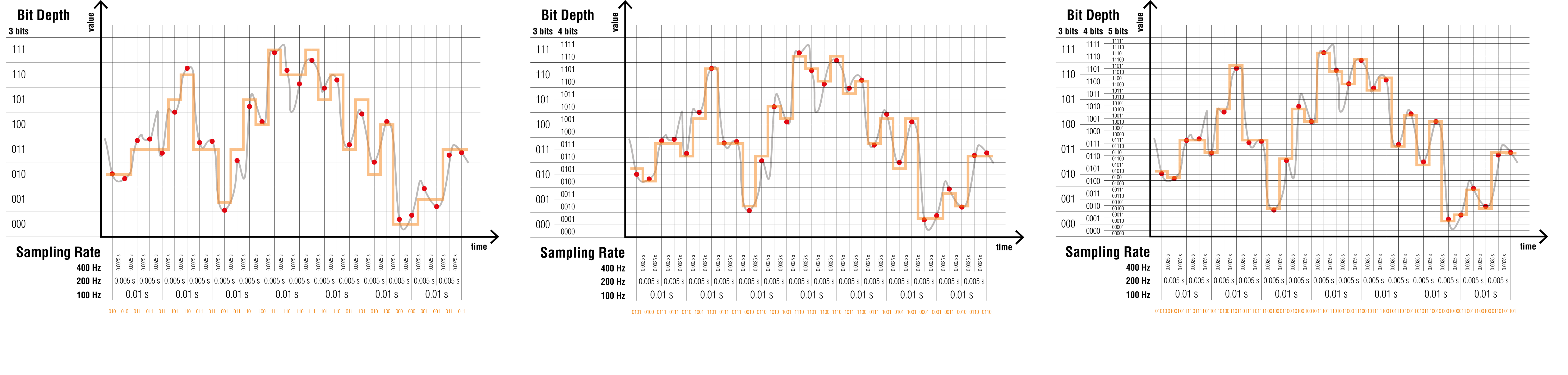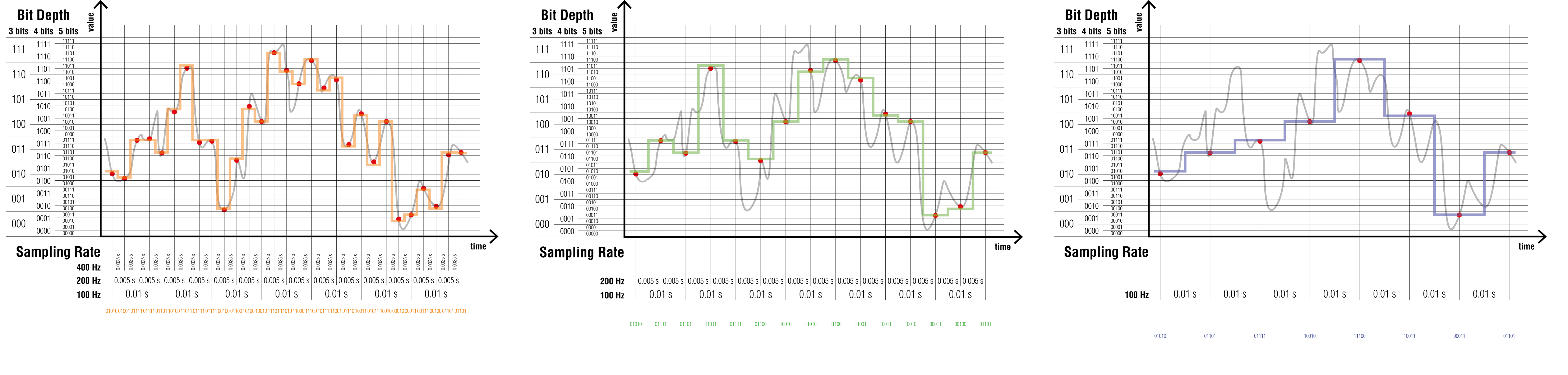 La précision de l’encodage est donnée par la profondeur de l’échantillonnage (bit depth) exprimée en bits (binary digits). Comme pour l’échantillonnage, plus la profondeur de l’échantillonnage est importante, plus la quantité d’information générée est importante.
